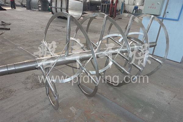 該機(jī)型由容器、螺旋攪拌葉片和傳動(dòng)部件組成:螺旋葉片一般做成雙層或三層,外層螺旋將物料從兩側(cè)向中央?yún)R集,內(nèi)層螺旋將物料從中央兩側(cè)輸送,形成對(duì)流混合。